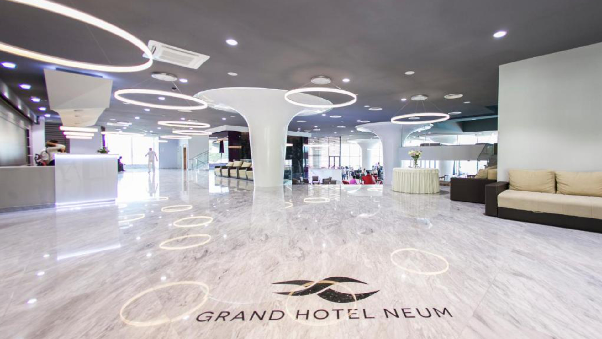 GRAND HOTEL NEUM 4* - to hotel z długoletnią tradycją. Usytuowany w środkowej części miasta, z  widokiem na nadmorski zalew, oddalony jest tylko 80 m od własnej plaży hotelowej. Posiada 3 windy, 4 restauracje, 2 cafe bary, 1 coctail bar, 3 sale konferencyjne, piękny taras, własną dyskotekę, własną salę kinową, internet bezprzewodowy, pokój zabaw dla młodzieży, restaurację na plaży, stoły do tenisa, bilard, mini golf, sklep., boiska do gry w piłkę nożną, kosza., i co najważniejsze przeszedł całkowitą rekonstrukcję z hotelu 2* na 4* z pięknie i luksusowo odnowionymi pokojami, odkrytym (25X15) basenem dla dorosłych z morską wodą, odkrytym basenem z morską wodą dla dzieci, świetnie wyposażonym wellnes & spa, saunę, siłownię, dyskoteką, nocny klub. Plaża, długości ok. 400 m znajduje się tuż przy hotelu, można na nią zjechać windą hotelową lub dojść ścieżką przez park. Plaża  jest drobno-kamienista z płytkim wejściem do wody, w sezonie wysypywana jest drobnym, jasnym piaskiem. Deptak wzdłuż plaży rozciąga się na przestrzeni kilku kilometrów. Parking dla gości-w cenie imprezy. Nowością jest odkryty, panoramiczny basen na dachu otwarty w sezonie od 01.05-01.10.